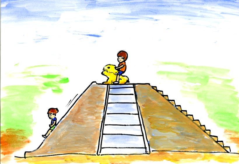 こどもたちは ライオンのせなかに のってから すべりだいを すべりました。
